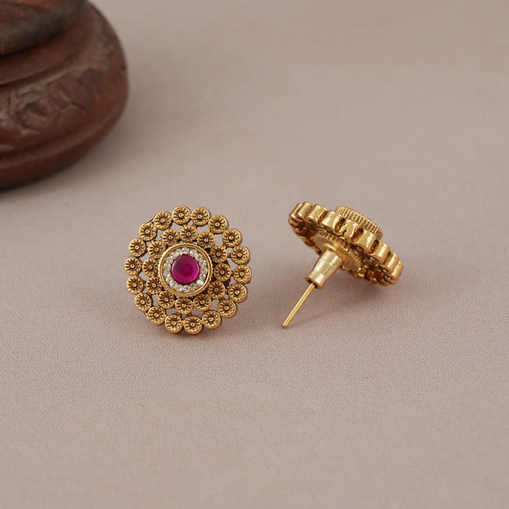 Stunning antique gold stone stud earring show-stopping and come in traditional Indian design with gold plating and handwork.